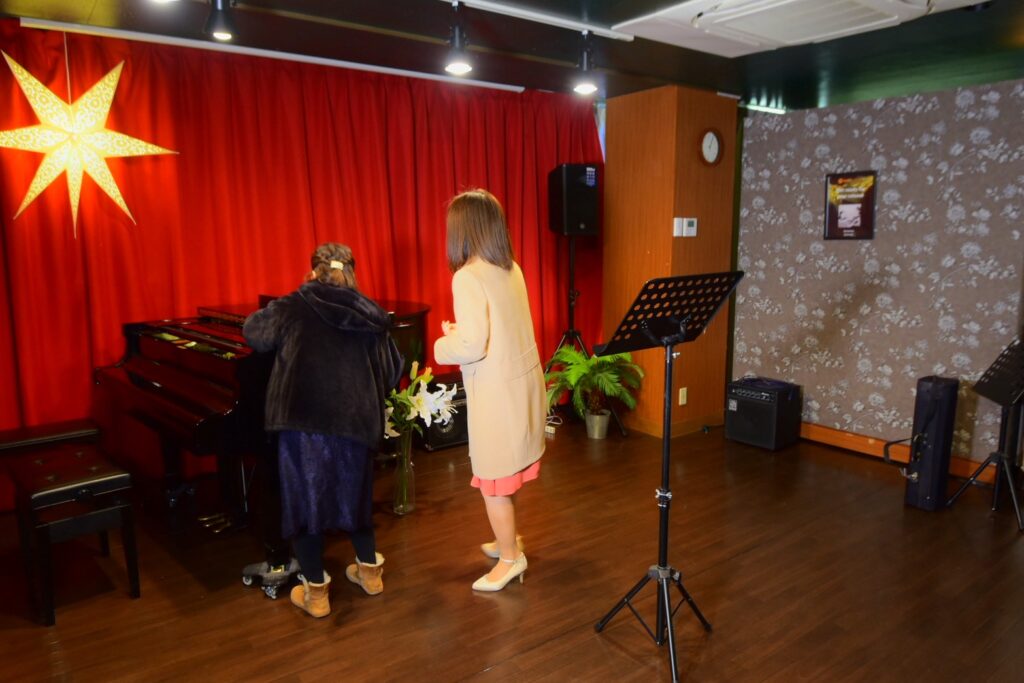オフショット:ピアノの蓋を閉めるか半開か相談中