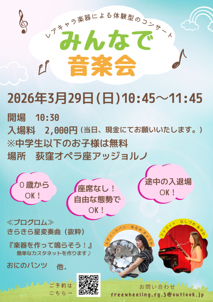 ♪ファミリー向け『みんなで音楽会』 3月29日(日)に開催♪ 2026 2/09 2026年2月7日2026年2月9日 ご予約はコチラ 2026年3月29日(日) 10:45~11:45 開場 10:30 入場料 2,000円(当日、現金にてお支払いいただきます) ※中学生以下のお子様は無料 場所 荻窪オペラ座アッジョルノ お知らせ マチ音 vol.2 3月14日(土)に開催♪ 関連記事 マチ音 vol.2 3月14日(土)に開催♪ 2026年2月7日 マチ音 vol.1 2026年1月25日♪ 2026年1月27日 ホームページを公開しました。 2026年1月27日